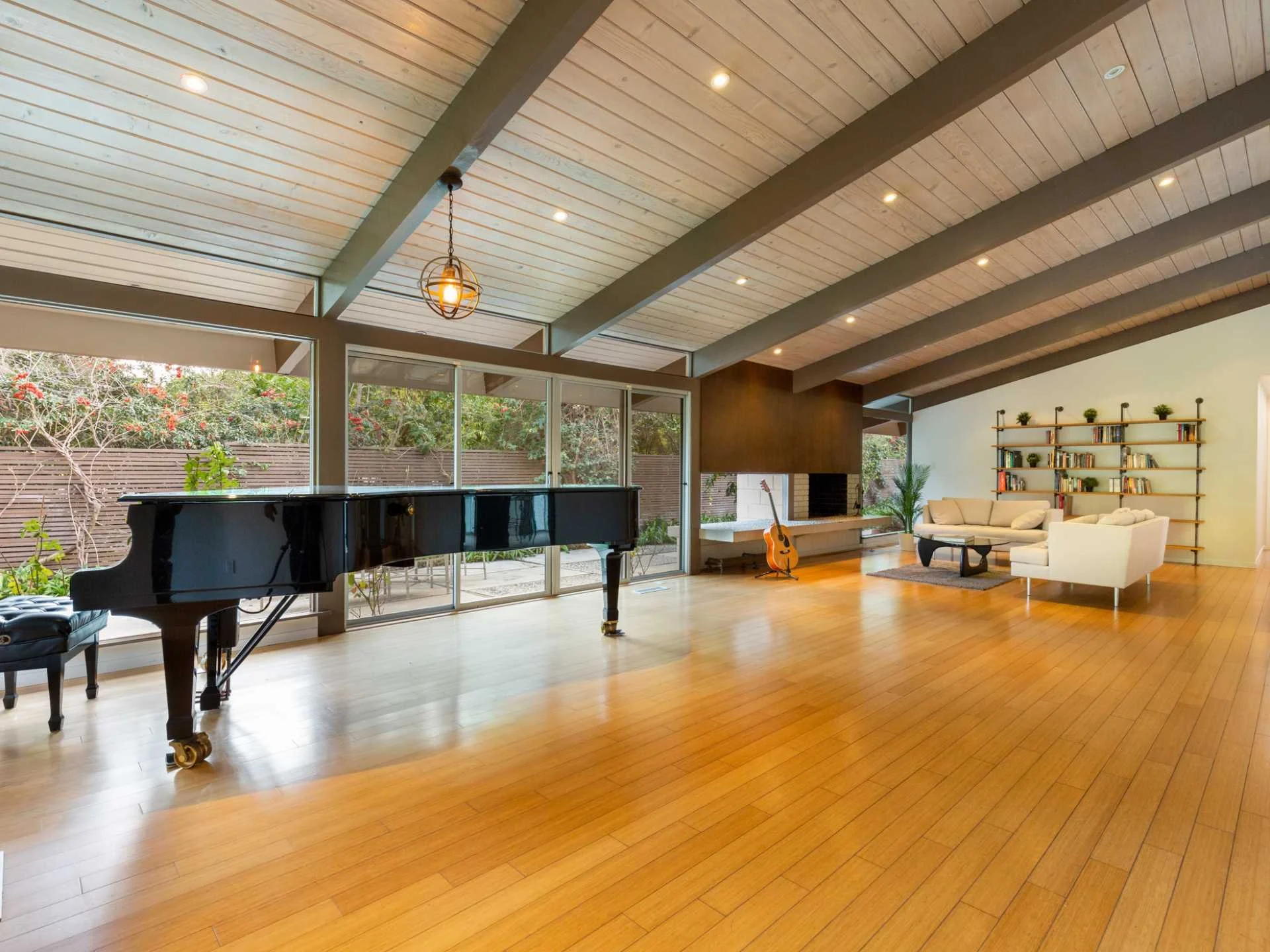 Amazing opportunity to live in this Beautiful former celebrity owned Mid-Century Modern residence.~~ This stunning 3BR+2.5BA private compound has been re-designed for a modern lifestyle, with a sun filled expansive open floor plan featuring soaring wood beam vaulted ceilings, bamboo floors & sliding walls of glass in almost every room. The house provides a seamless indoor/outdoor transition to the tranquil exterior spaces including a grassy yard and space options for a pool if desired. The spectacular living room has an original real wood burning Fireplace & the built-in cocktail bar w/ wine refrigerator in the living room is perfect for entertaining. The house has a Gorgeous gourmet kitchen w/ breakfast bar, professional Viking stainless steel appliances & a pantry which opens to the media/family room w/ Terrazzo floors modular electronic skylights with roller shades. The luxurious master suite offers high wooden beamed ceilings, a sitting area, walk-in closet & spa-like bathroom w/ dual sinks & soaking tub. Two further bedrooms offer direct access to the yard and built in closets with access to a further full bathroom. Conveniently located on one of the best streets in Laurel Hills off Mulholland Drive the house is walking distance to hiking trails
