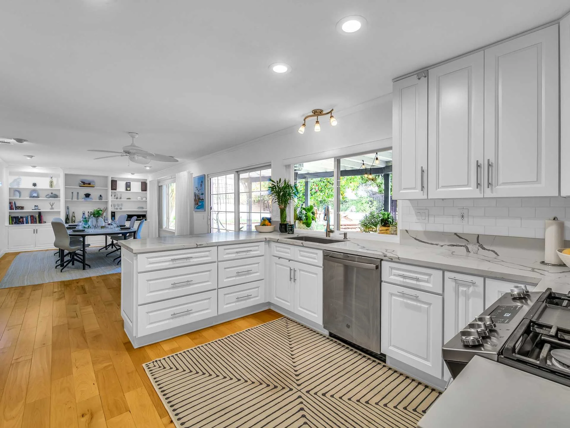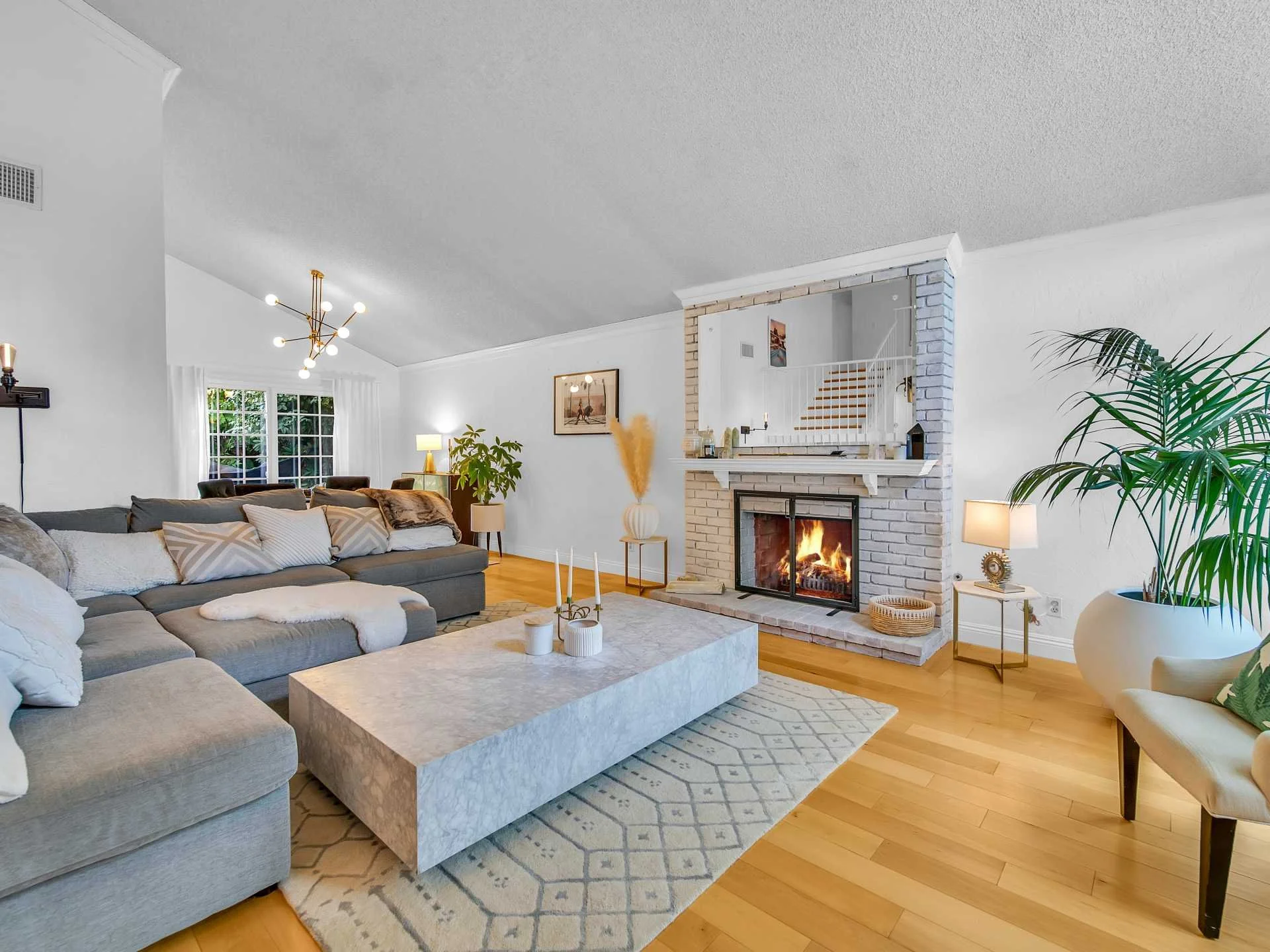Beautiful two story pool home located at the end of a quiet cul-de-sac. The entryway welcomes you with double-height vaulted ceiling, a large chandelier and stunning maple wood floors. A charming living room with brick fireplace tie the open floor plan together with the formal dining area, and staircase. Generously sized windows and glass sliding door allow for natural light to show off the remodeled kitchen featuring quartz countertops, stainless steel appliances, and modern soft-close drawers. Sweeping views of the backyard can be enjoyed from all areas of the kitchen and dining room. Surrounded by lush landscaping - including orange, lemon, grapefruit, and pomegranate trees - the home has a beautiful sense of privacy and tranquility. The entertainer's backyard boasts a wide variety of amenities; gated, heated pool and spa, separate seating area with a fire pit, large covered patio, and a built-in BBQ. One bedroom, an updated full bathroom, laundry room, and attached double garage complete the lower level. The upstairs remodeled master bedroom retreat boosts double-vaulted ceilings, a large private balcony, and a fully remodeled en-suite bathroom with dual sinks, a luxurious shower, and plenty of closet space. The two additional upstairs bedrooms overlook the backyard and share a full bathroom. A bonus area, suitable as home-office, playroom for little ones or extra storage, complete the upper level. Located moments away from the popular Topanga Mall/The Village, with plenty off shopping and restaurant options, as well as scenic hikes and mountain bike trails just around the corner - this home is a must see!